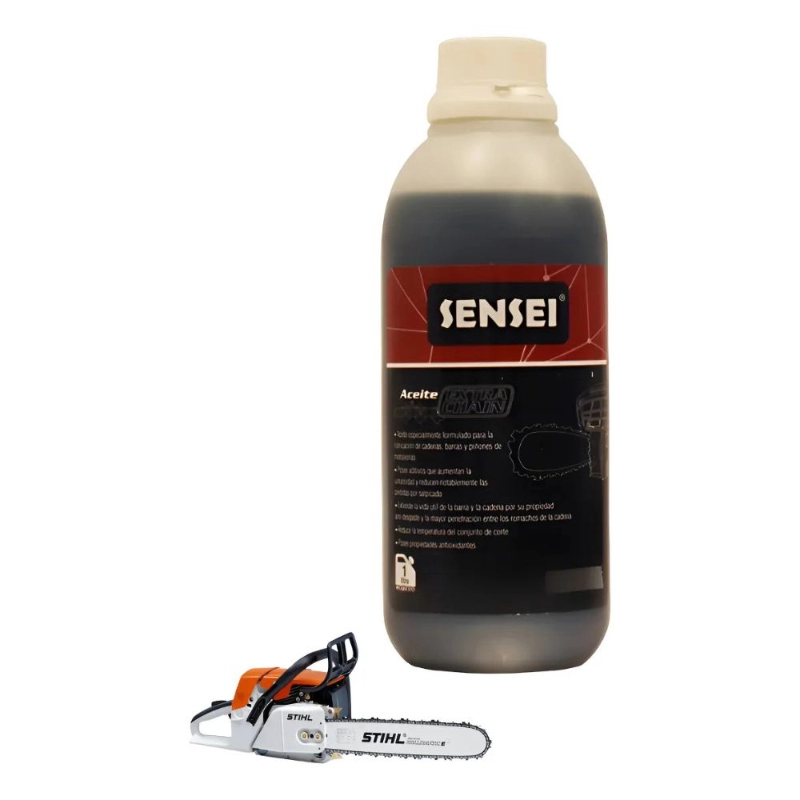 Aceite SENSEI Extra Chain de 1 Litro, formulado para la lubricación óptima de cadenas, barras y piñones de motosierras. Ofrece propiedades anti-desgaste, reduce salpicaduras y extiende la vida útil del equipo.