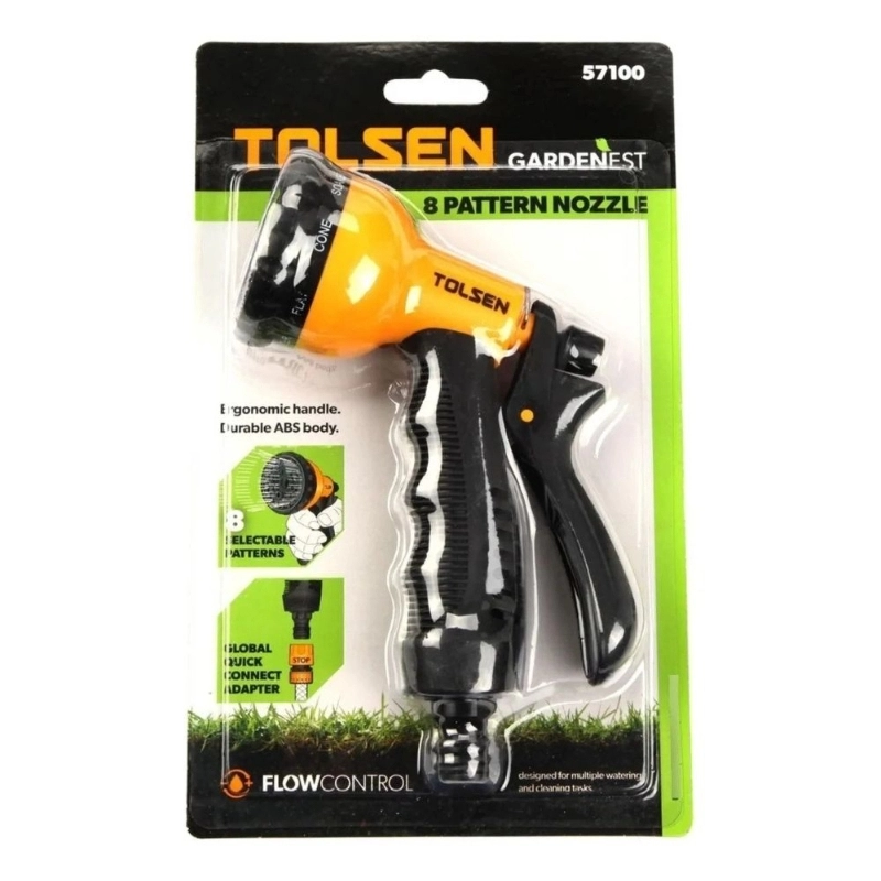 Pistola de riego TOLSEN con 8 patrones de chorro ajustables, diseñada para ofrecer máxima versatilidad en el jardín. Fabricada con materiales duraderos y equipada con acople para mangueras de 1/2 pulgada, garantiza eficiencia y comodidad en el cuidado de áreas verdes.