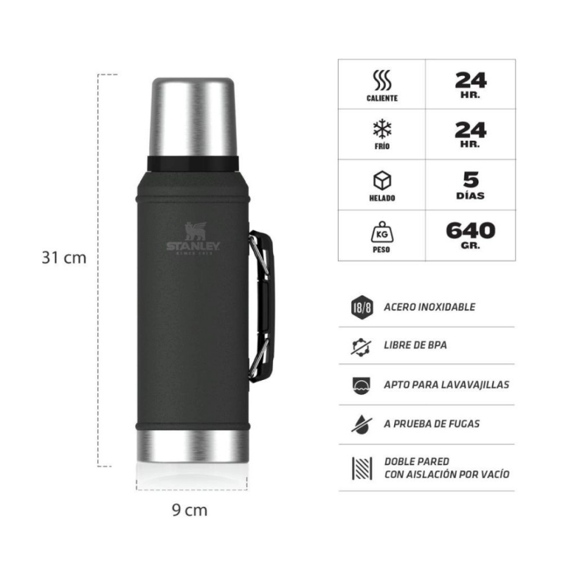 Termo STANLEY Clasico Negro 950ML, es la versión más compacta y funcional de un ícono de la durabilidad. Construido en acero inoxidable de doble pared, mantiene tus bebidas calientes por 28 horas, frías por 26 horas y con hielo hasta por 5 días. Su tamaño lo hace ideal para el día a día, en la oficina, en el auto o en una escapada. Un compañero robusto y confiable, con la legendaria garantía de Stanley.