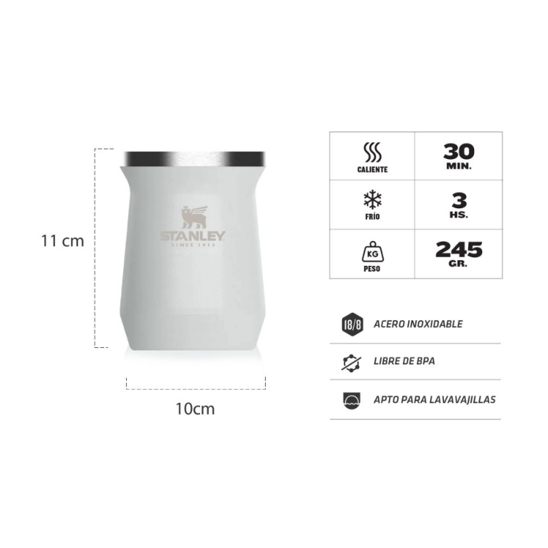 Mate STANLEY Blanco 236ML, es el mate perfecto para quienes buscan la legendaria durabilidad de Stanley en un tamaño compacto. Con su construcción de doble pared de acero inoxidable, mantiene la temperatura de tu bebida caliente o fría por 30 minutos y el hielo por 3 horas. Su diseño robusto, fácil de limpiar y a prueba de fugas lo convierte en el compañero ideal para tus escapadas, el auto o el escritorio.