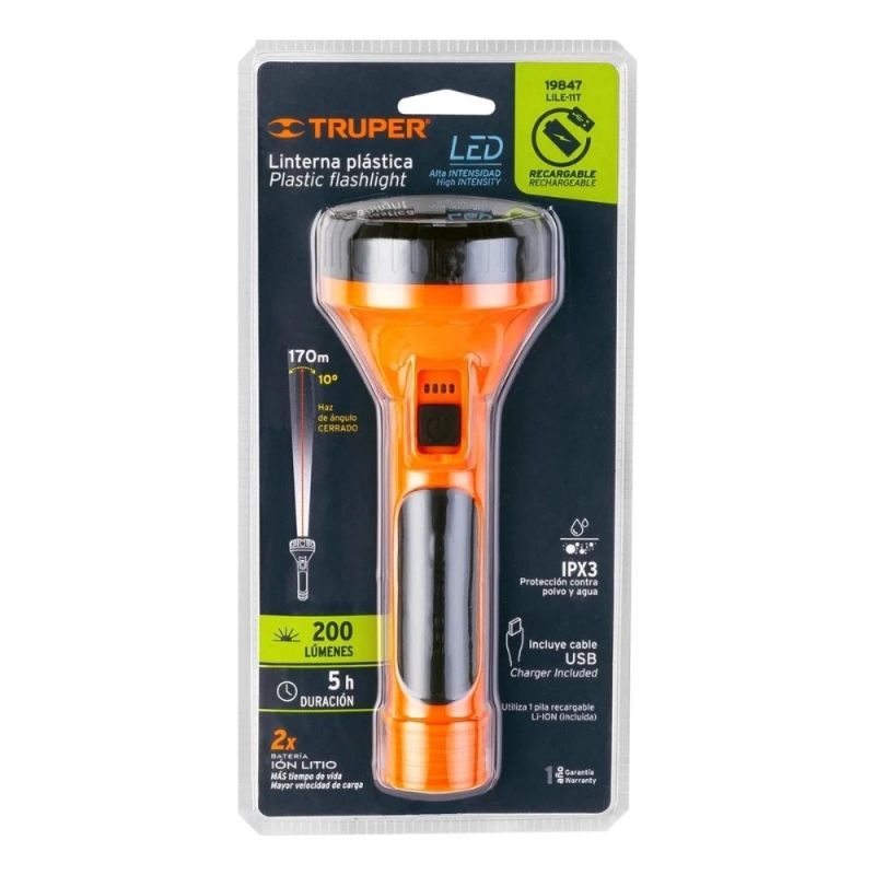 Linterna LED recargable de 200 lúmenes, diseñada para ofrecer iluminación eficiente y portátil. Ideal para uso doméstico, en talleres o como equipo de emergencia vehicular, destacando por su autonomía y diseño compacto.