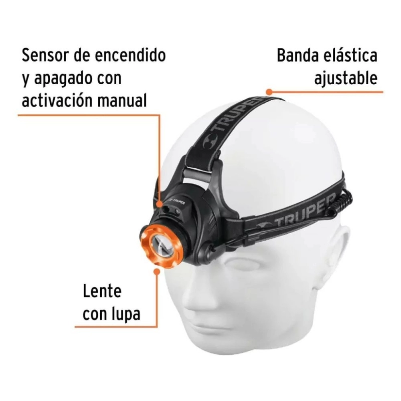 Linterna frontal LED TRUPER recargable, diseñada para uso manos libres. Ofrece 300 lúmenes de potencia y un alcance de 165 metros, ideal para actividades al aire libre y trabajos en condiciones de baja iluminación.