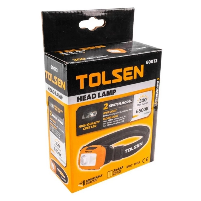 Linterna frontal TOLSEN de 300 lúmenes, diseñada para iluminación manos libres en actividades que requieren precisión y movilidad. Su diseño compacto, ligero y vincha ajustable la hacen ideal para uso en senderismo, camping y trabajos técnicos.