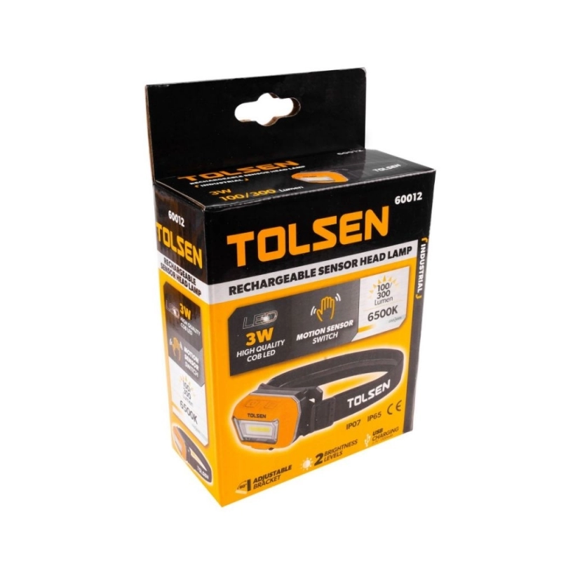Linterna frontal TOLSEN de alto rendimiento, equipada con sensor de movimiento para operación manos libres. Ofrece una potencia lumínica de 300 lúmenes y es recargable, ideal para diversas aplicaciones técnicas y profesionales.