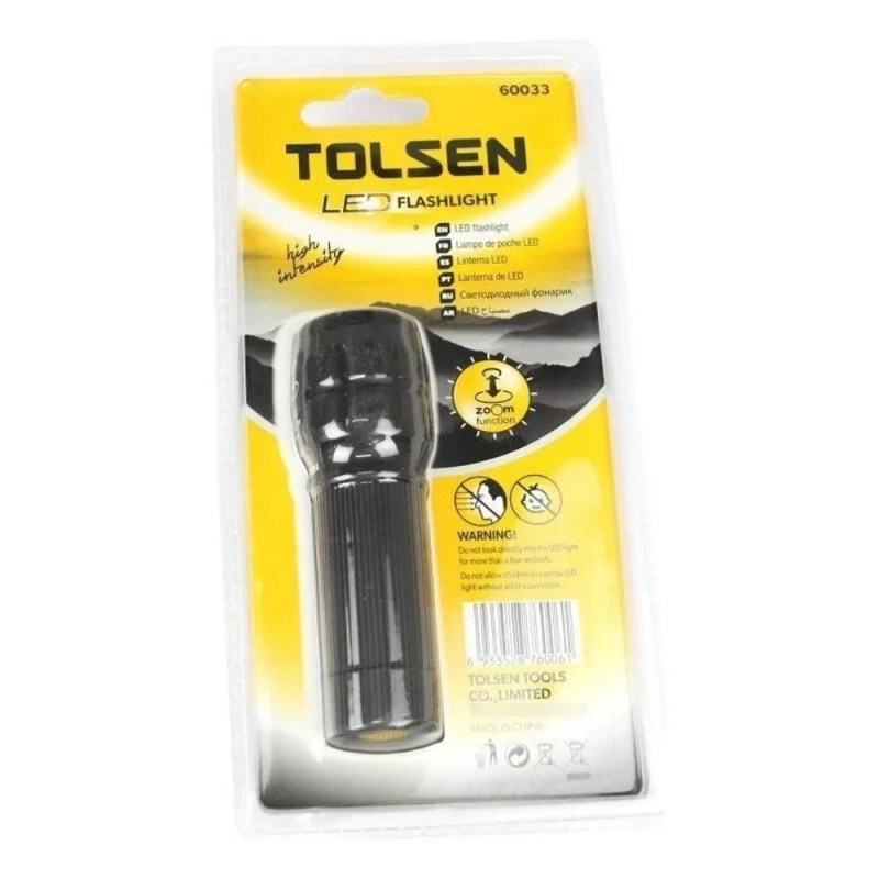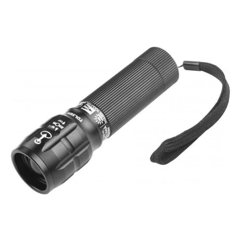 Linterna LED TOLSEN de 150 lúmenes con función de zoom óptico, ideal para iluminación versátil y precisa en diversas aplicaciones.