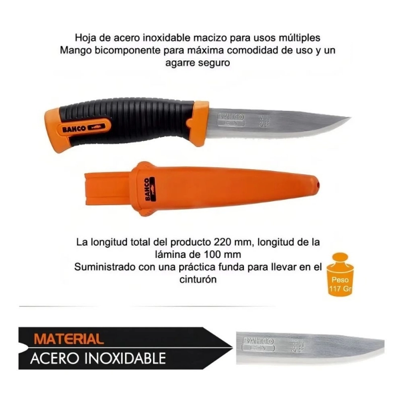 Cuchillo BAHCO Acero Inoxidable Mango Bicomponente,es una herramienta de corte versátil y duradera, ideal tanto para profesionales como para tareas en el hogar. Su hoja de acero inoxidable proporciona un filo excepcional y una excelente resistencia a la corrosión, mientras que su mango ergonómico de bicomponente ofrece un agarre seguro y cómodo, reduciendo la fatiga durante el uso prolongado. Es la opción perfecta para quienes buscan calidad, rendimiento y confiabilidad.