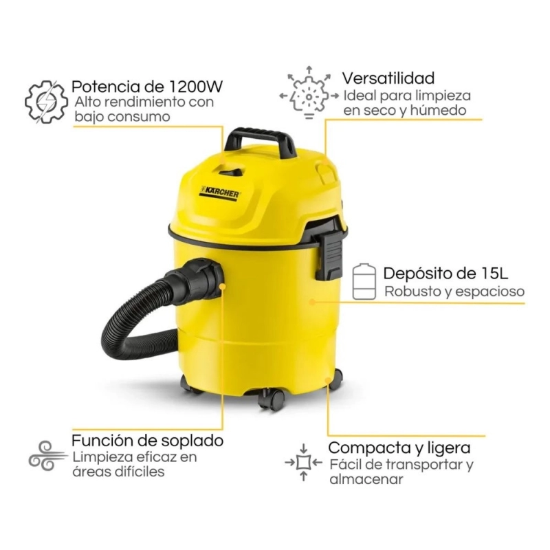 Aspiradora multiuso Kärcher WD 1 Classic, ideal para tareas de limpieza en seco y húmedo en el hogar y taller. Compacta y potente.