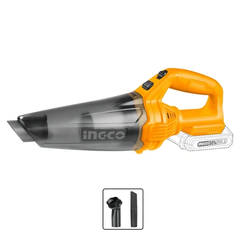 Aspiradora de mano inalámbrica INGCO de 20V con capacidad de 0.5 litros, diseñada para limpieza rápida y eficiente en diversas superficies. Requiere batería y cargador (no incluidos).