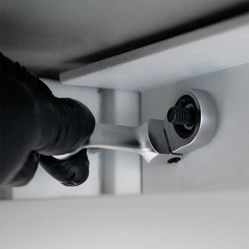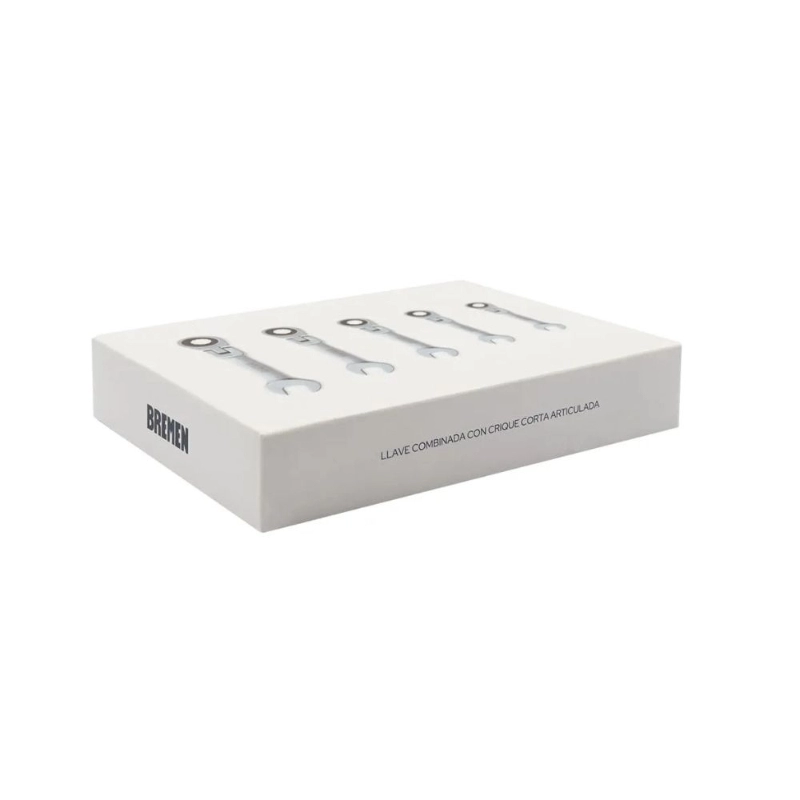 Juego de 5 llaves combinadas con crique BREMEN, fabricadas en Acero Cromo Vanadio, ideales para trabajos de ajuste y desajuste en espacios reducidos.