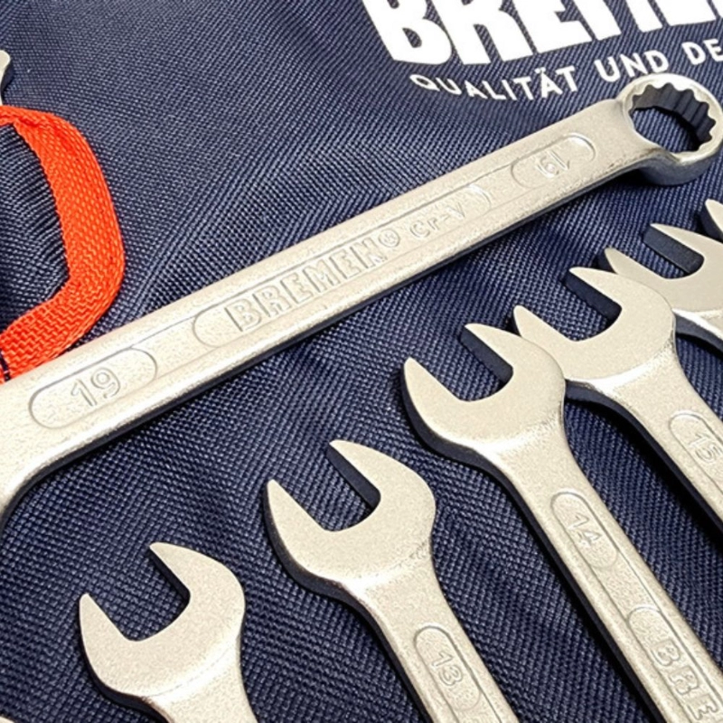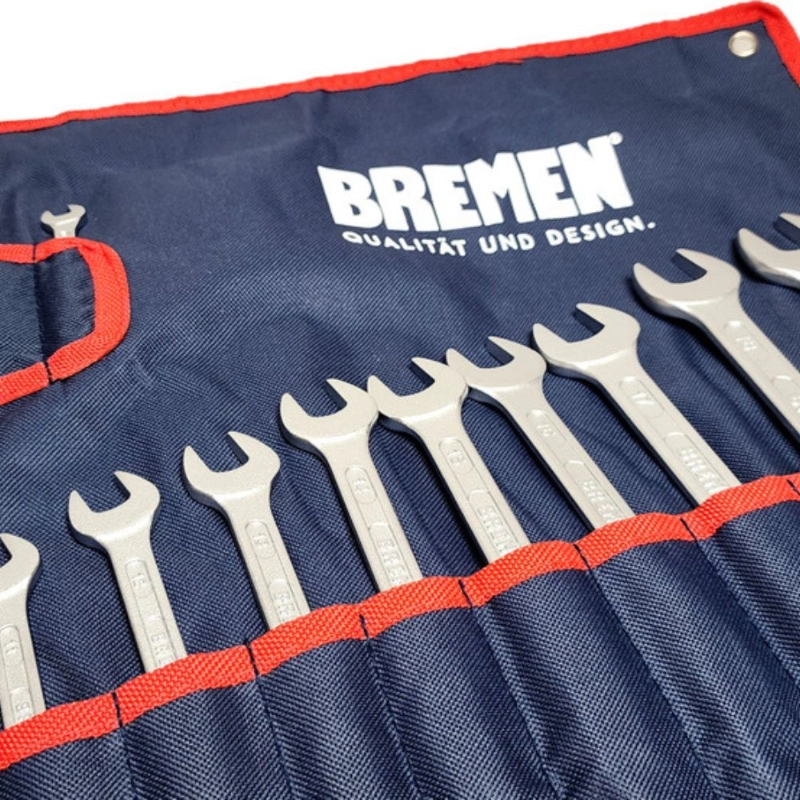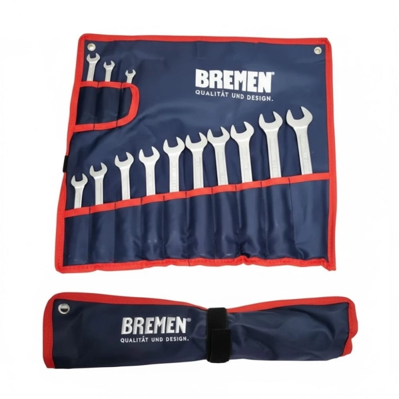 Juego profesional de 13 llaves combinadas BREMEN, forjadas en Acero Cromo Vanadio de alta resistencia. Incluye estuche organizador para almacenamiento y transporte eficiente.