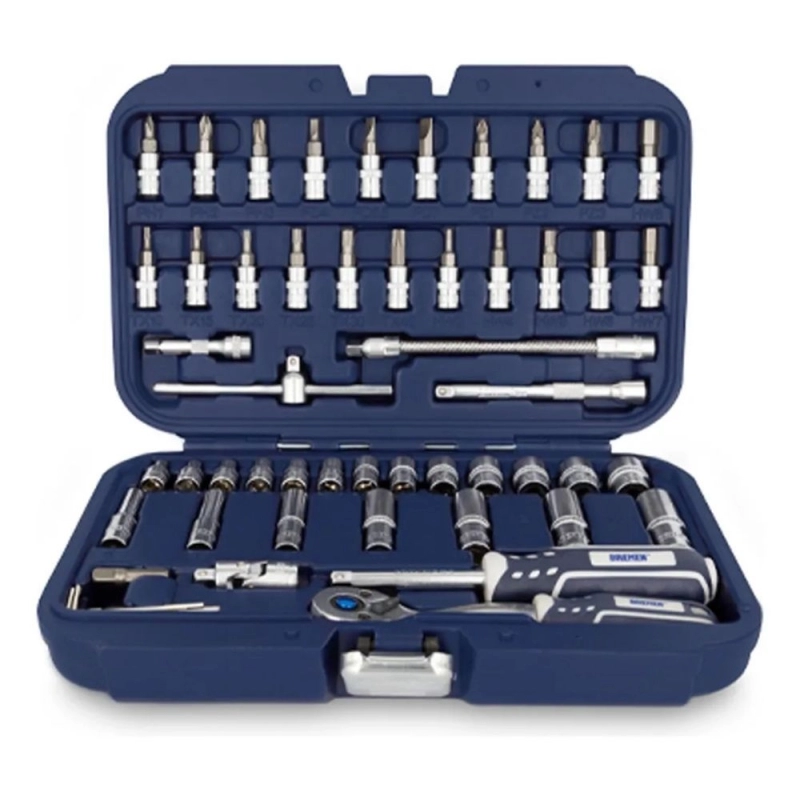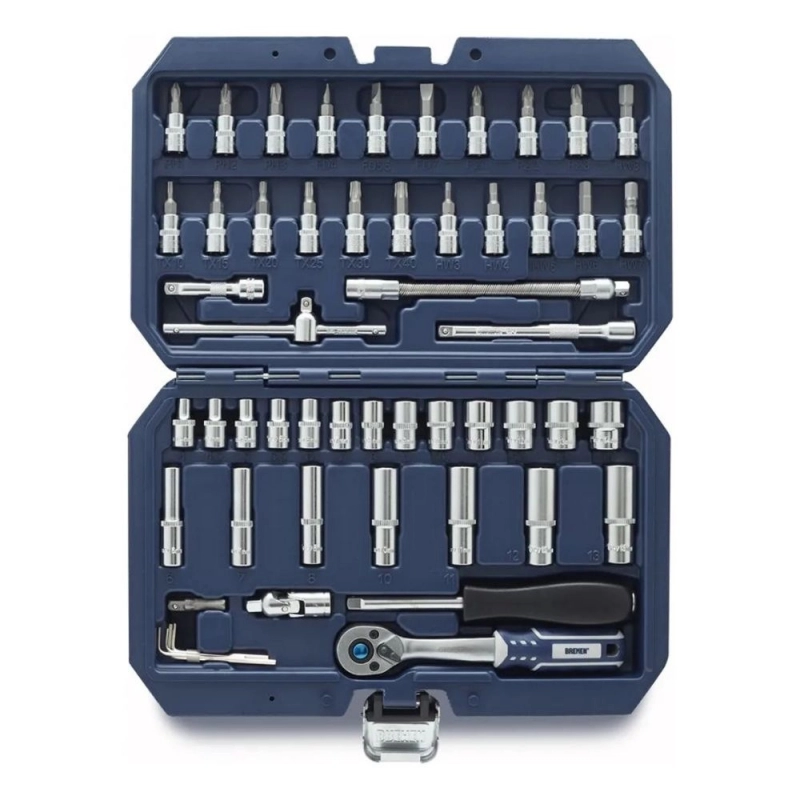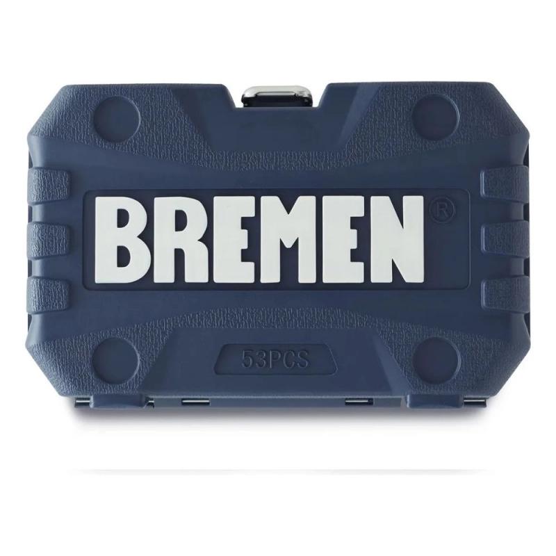 Juego de bocallaves BREMEN modelo 6728 de 53 piezas, fabricado en Acero Cromo Vanadio con encaje de 1/4" y medida métrica. Ideal para trabajos de precisión y mantenimiento profesional.