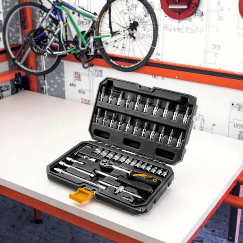 Juego de bocallaves TOLSEN 15138 de 46 piezas, fabricado en Acero Cromo Vanadio con encastre de 1/4", diseñado para trabajos de mecánica, mantenimiento y reparación profesional.