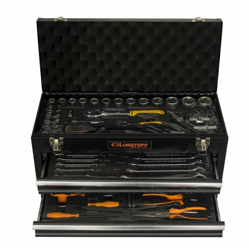 Juego de herramientas profesional LÜSQTOFF de 80 piezas, diseñado para tareas de mantenimiento y reparación. Incluye un robusto gabinete metálico para óptima organización y protección.