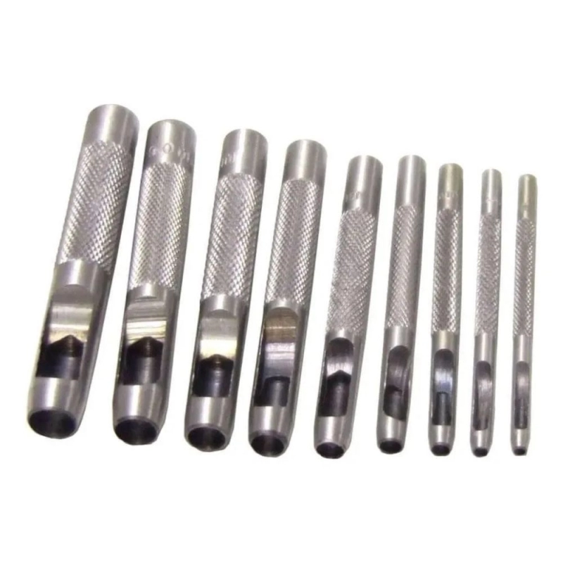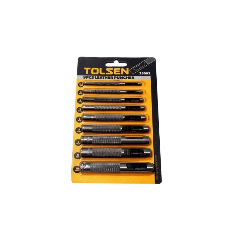 Juego de sacabocados de precisión TOLSEN, compuesto por 9 piezas, diseñado para realizar perforaciones limpias y exactas en materiales blandos. Ideal para aplicaciones profesionales y de bricolaje en cuero, goma, cartón, vinilo y juntas, ofreciendo versatilidad y durabilidad.