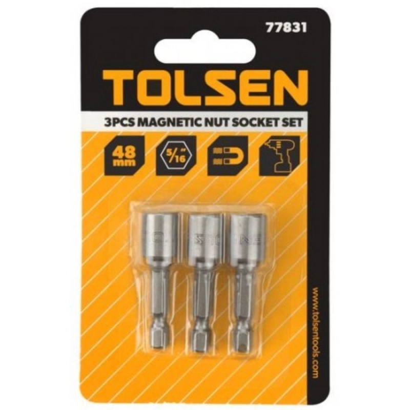 Juego de 3 boquillas magnéticas TOLSEN diseñadas para atornilladores, optimizando la sujeción de puntas y tornillos con máxima precisión y eficiencia en tareas de montaje.