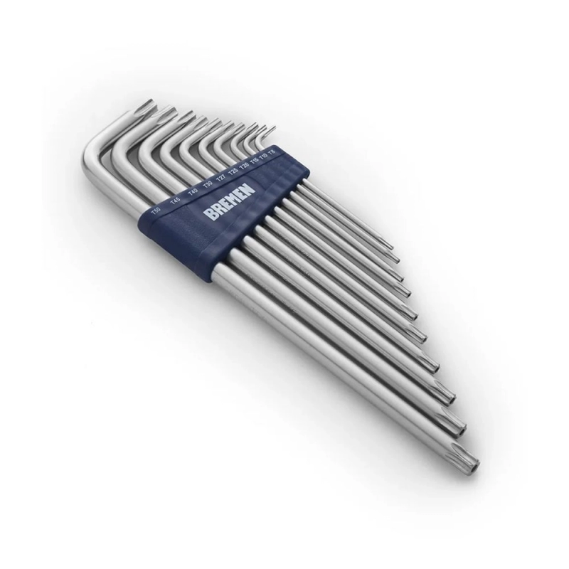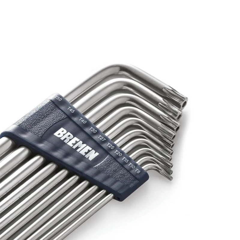 Set profesional de 10 llaves Torx Tamper extra largas BREMEN, diseñadas en formato L para un acceso óptimo y aplicación de torque en tornillos de seguridad.