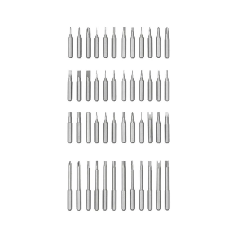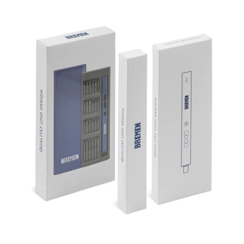 Set de destornilladores eléctricos de precisión BREMEN con 62 piezas, ideal para trabajos electrónicos y reparaciones delicadas.