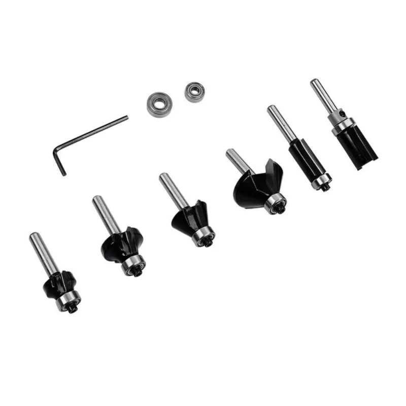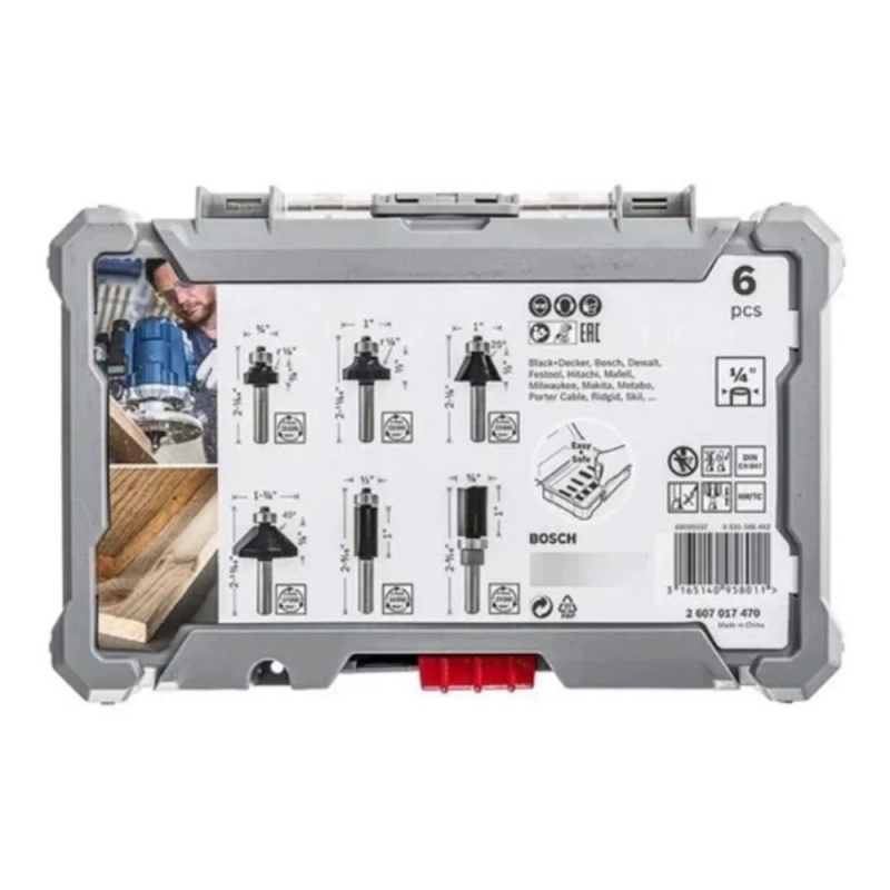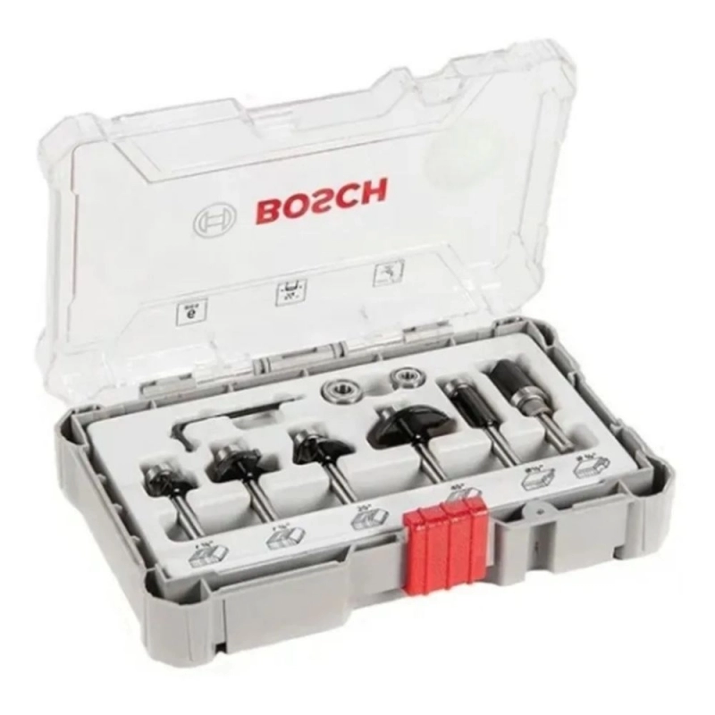 Set de 6 fresas BOSCH de carburo de tungsteno para router, ideal para trabajos de fresado en madera. Incluye perfiles variados para cortes y acabados profesionales.