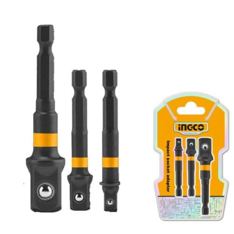 Set de 3 adaptadores magnéticos INGCO diseñados para la sujeción segura de tubos y puntas en herramientas de encastre hexagonal, optimizando tareas de atornillado y ajuste.