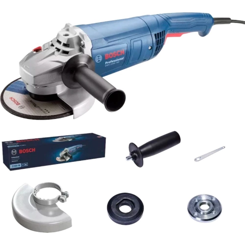 Amoladora angular profesional Bosch GWS 2200 con motor de 2200W, diseñada para trabajos de desbaste y corte de alta exigencia en materiales diversos.