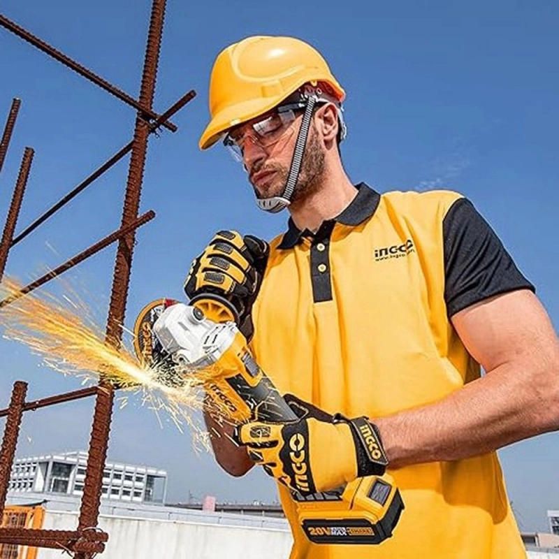 Amoladora angular inalámbrica INGCO de 20V con disco de 115mm, diseñada para trabajos de corte y desbaste en diversas superficies.