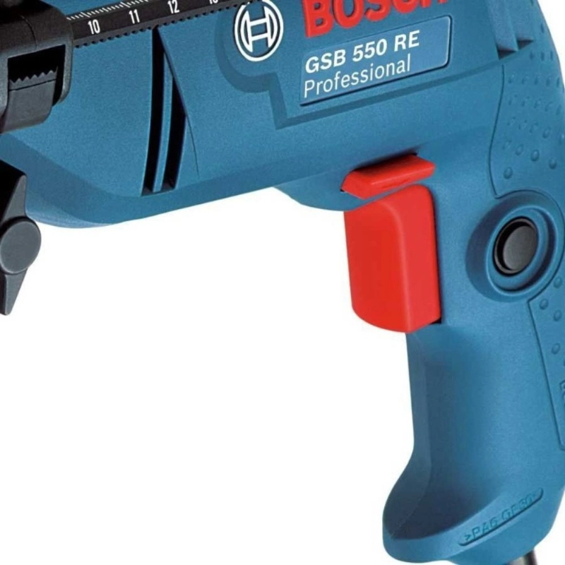 Taladro percutor Bosch GSB 550 RE de 550W, diseñado para perforaciones eficientes en concreto, metal y madera. Herramienta robusta y confiable para uso profesional.