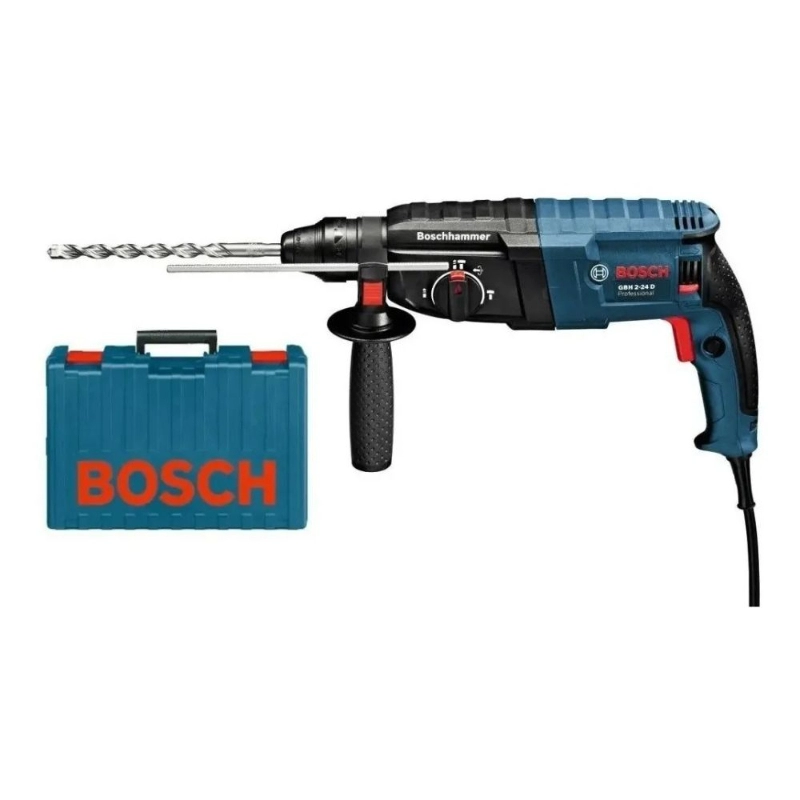 Potente rotomartillo Bosch GBH 2-24 D de 820W con encastre SDS Plus, ideal para perforación y cincelado en concreto y mampostería. Ofrece 2.7 J de energía de impacto y tres modos de operación para máxima versatilidad.