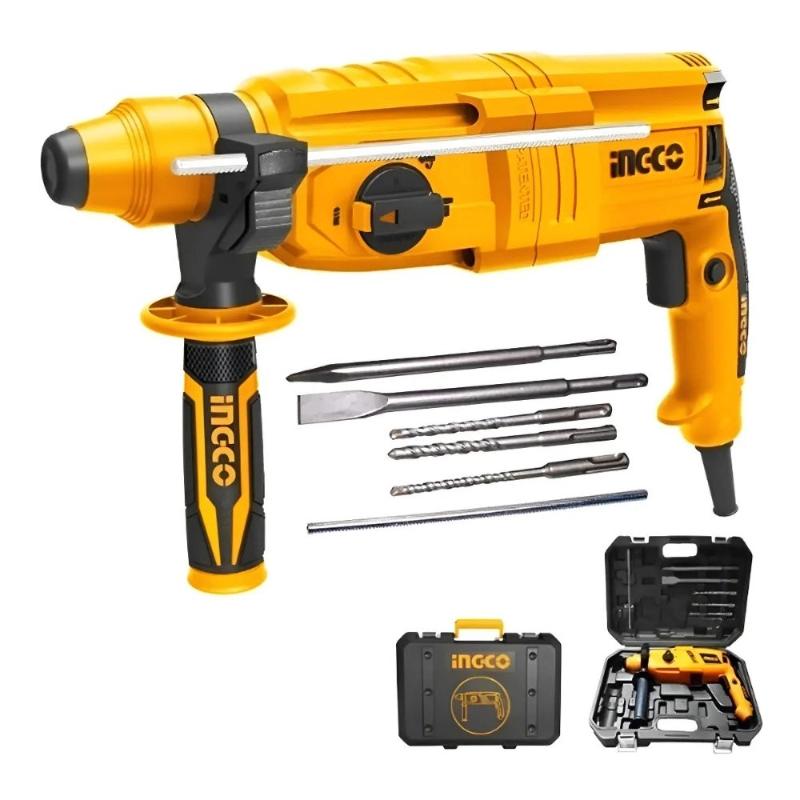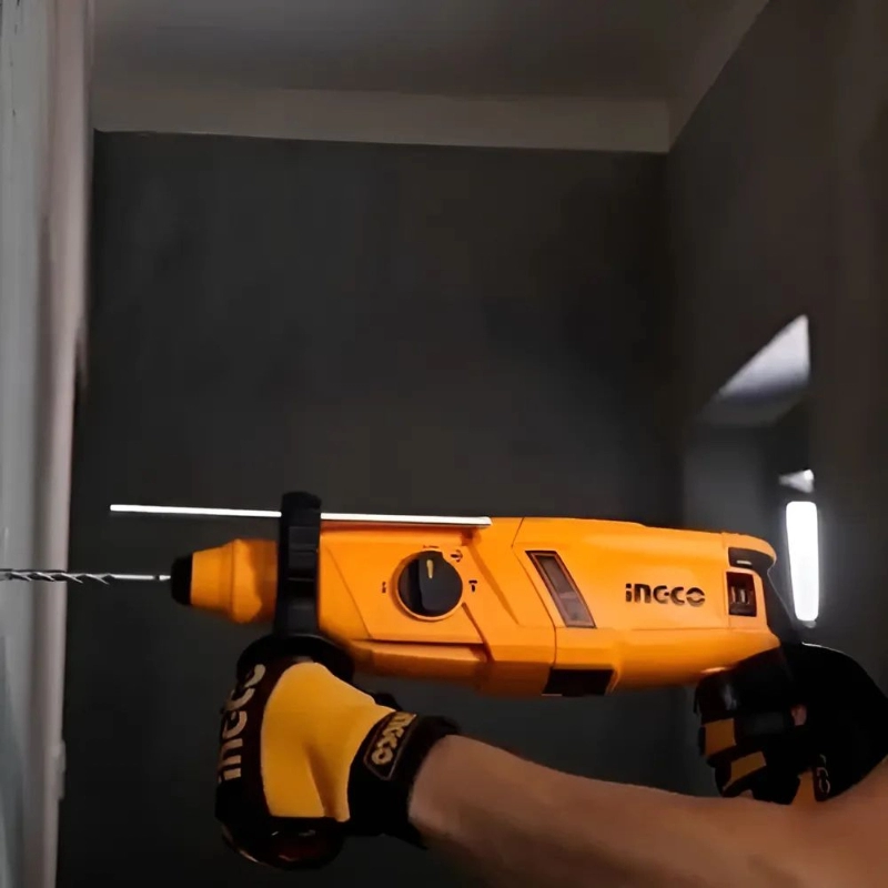 Rotomartillo INGCO de 800W con capacidad de perforación de 26mm, ideal para trabajos de perforación y cincelado en concreto y mampostería. Equipado con sistema de encastre SDS Plus para un cambio rápido de accesorios.