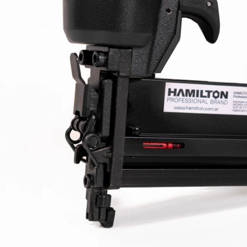 La Clavadora y Engrapadora Neumática Hamilton es una herramienta profesional 2 en 1, robusta y versátil, diseñada para ofrecer máxima eficiencia y precisión en una amplia gama de proyectos. Su funcionamiento mediante aire comprimido asegura una fijación rápida y segura con clavos y grapas. Fabricada con cuerpo de aluminio, garantiza durabilidad y un peso optimizado para un manejo confortable durante usos prolongados. Es la solución ideal para aplicaciones en carpintería, ensamblaje de muebles, tapicería, revestimientos y trabajos de acabado en construcción. Soporta clavos rectos de 50-90mm y grapas de corona estrecha de 10-40mm, ambos en calibre 18GA, proporcionando una excelente adaptabilidad. Incorpora un cargador de alta capacidad y un sistema de acople rápido para una conexión eficiente a la red neumática. Se suministra con un maletín de transporte y acoples rápidos, permitiendo una puesta en marcha inmediata y facilitando su movilidad.