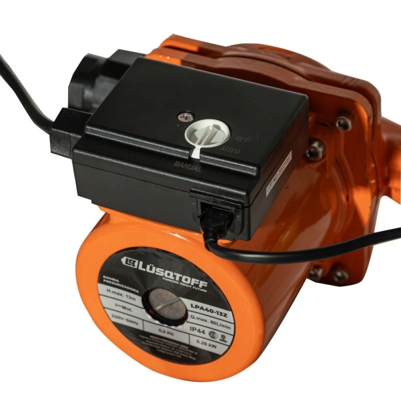 Electrobomba presurizadora LÜSQTOFF de 260W, diseñada para optimizar la presión de agua en sistemas domésticos y comerciales. Ofrece una altura máxima de elevación de 13 metros y opera con un voltaje de 220V, garantizando un suministro constante y eficiente.