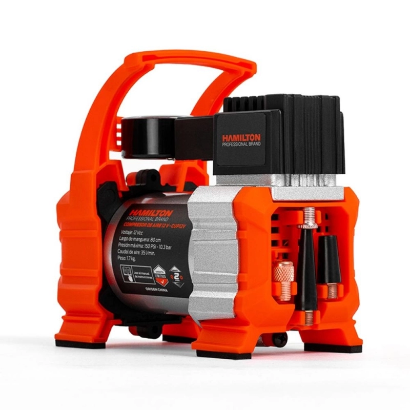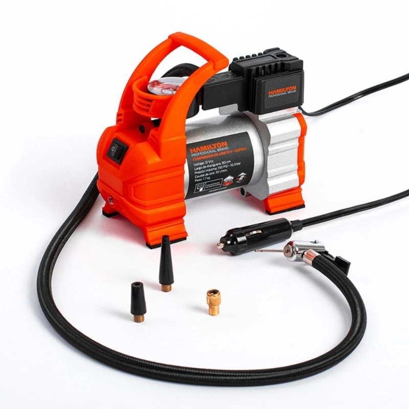 Compresor de aire portátil HAMILTON de 12V, diseñado para inflado de neumáticos y alimentación de herramientas neumáticas ligeras en vehículos.