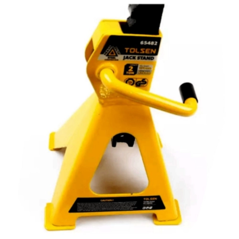 Juego de caballetes trípode TOLSEN con capacidad de carga de 2 toneladas, diseñado para proporcionar soporte seguro y estable a vehículos durante trabajos de mantenimiento y reparación en talleres automotrices.