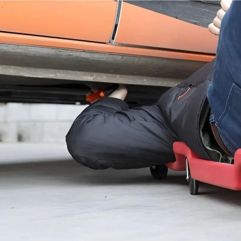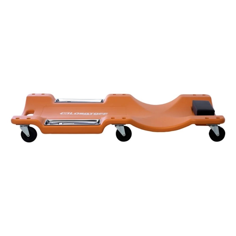 Camilla de mecánico LÜSQTOFF fabricada en plástico de alta resistencia, ideal para trabajos bajo vehículos. Sus dimensiones de 100x49 cm y diseño ergonómico facilitan el acceso y la comodidad en el taller.