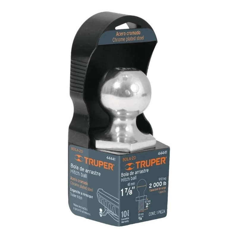 La bola de remolque TRUPER de 2000 LBS es un componente esencial para el arrastre seguro y eficiente de remolques, caravanas y otros equipos. Fabricada con acero de alta resistencia, esta bola garantiza una durabilidad excepcional y un rendimiento fiable bajo las condiciones más exigentes. Su diseño robusto y acabado cromado resistente a la corrosión aseguran una larga vida útil y un mantenimiento mínimo. Ideal para vehículos que requieren una solución de remolque robusta y segura, la bola TRUPER cumple con los estándares de calidad para proporcionar tranquilidad en cada viaje. Compatible con diversos tipos de acoples, ofrece versatilidad y facilidad de instalación.