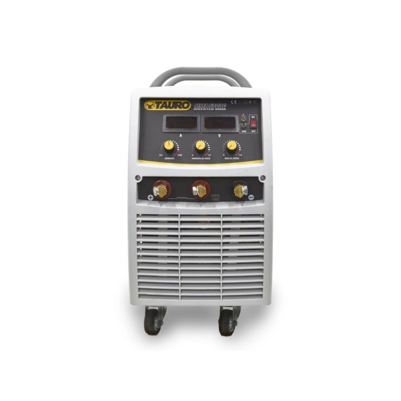 Equipo de soldadura inverter profesional TAURO IMMA 5000 C, diseñado para electrodos MMA. Ofrece alta potencia y eficiencia para trabajos exigentes, con funciones avanzadas que garantizan un arco estable y resultados de calidad superior.