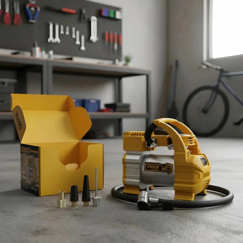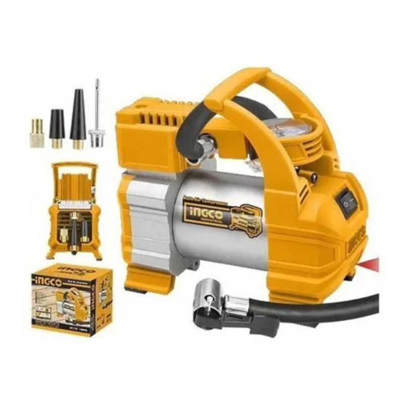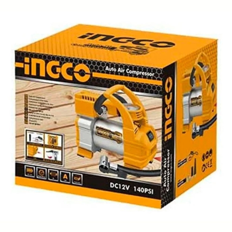 Compresor de aire portátil INGCO de 12V con apagado automático y presión máxima de 140 PSI, ideal para el inflado rápido y preciso de neumáticos vehiculares.
