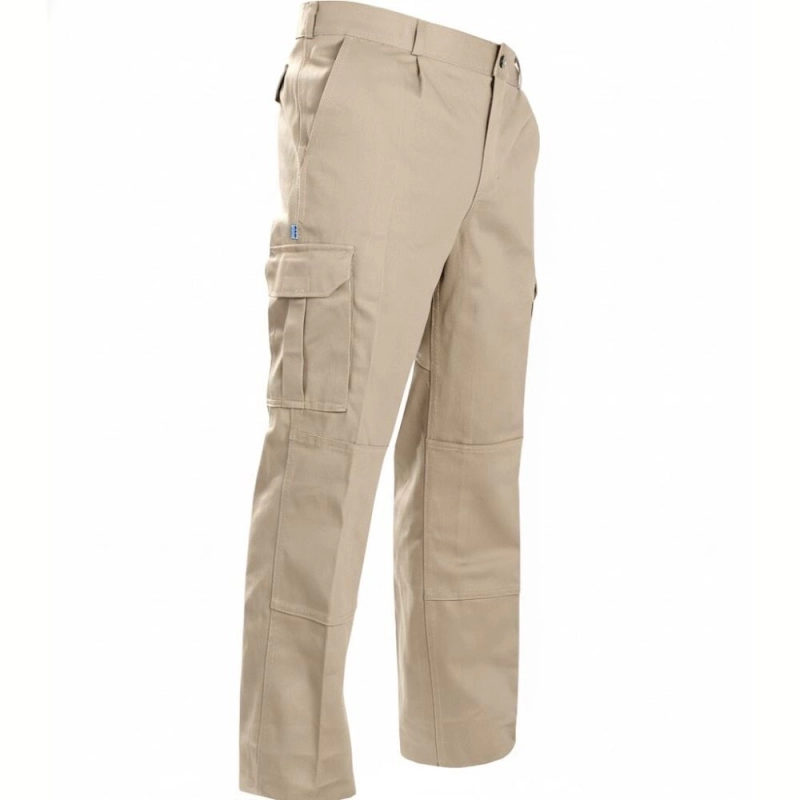 Pantalón cargo diseñado para uso industrial, confeccionado en tela Grafa de alta resistencia y color beige. Ofrece durabilidad y confort para entornos laborales exigentes.