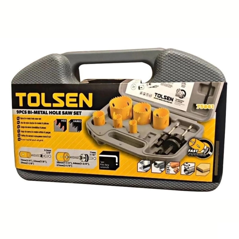 Set profesional de 9 sierras copa bimetálicas TOLSEN, diseñado para perforaciones precisas y eficientes en una amplia gama de materiales, incluyendo metal, madera y plástico.