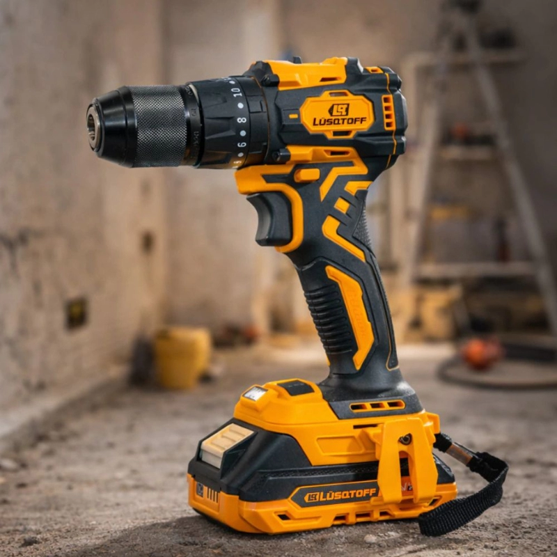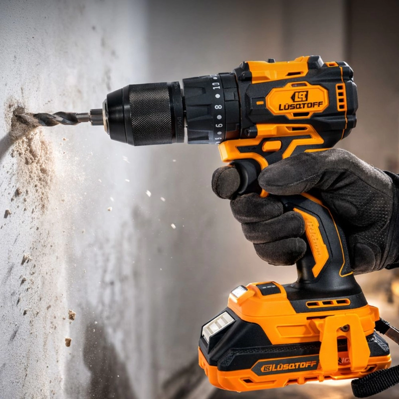 Taladro percutor inalámbrico LÜSQTOFF con motor Brushless de 13mm, ideal para perforaciones de alta exigencia en diversos materiales. Ofrece autonomía y rendimiento superior sin cables.