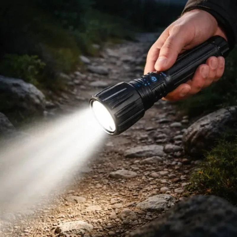 Linterna LED de alta potencia (1000 lúmenes) con cuerpo de aluminio resistente y batería recargable, ideal para uso profesional y general.