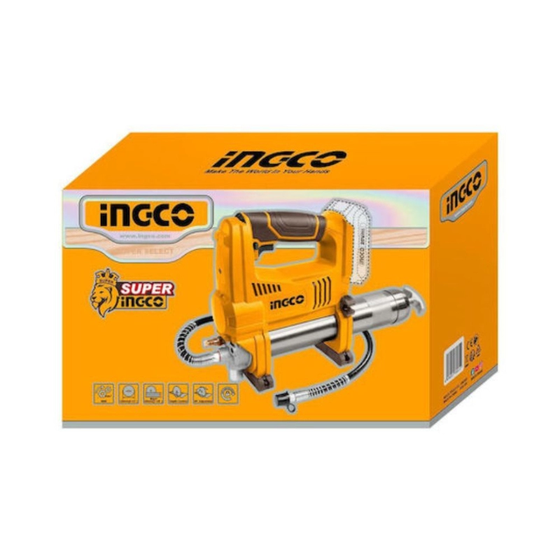 Pistola engrasadora inalámbrica INGCO GGLI2010 de 20V, diseñada para lubricación eficiente y precisa en entornos profesionales e industriales. Ofrece movilidad y alto rendimiento.